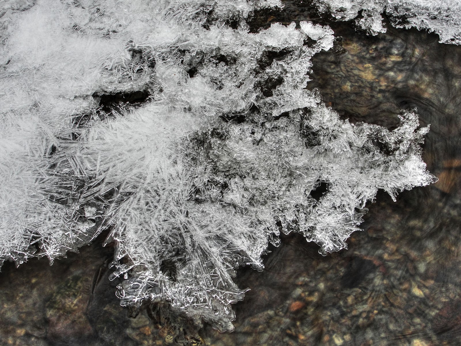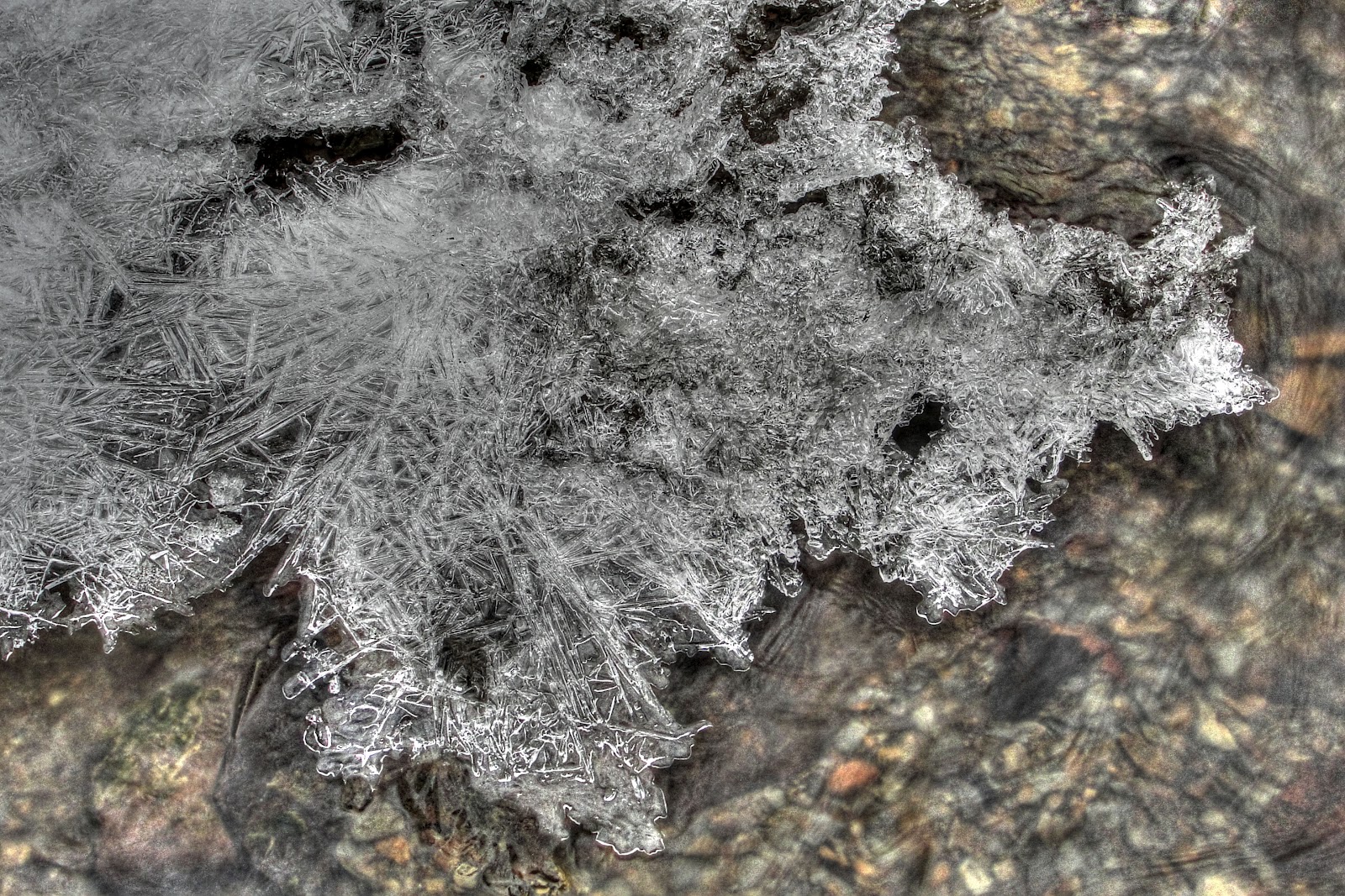 The resulting image is a little more ‘enhanced’ than I typically work toward but I think it works by highlighting the structure within the ice. The painterly option for the enhancer mode in Photomatix helped bring the stones on the creek bed into view and I think they contrast with the ice nicely.