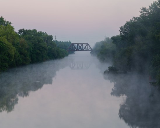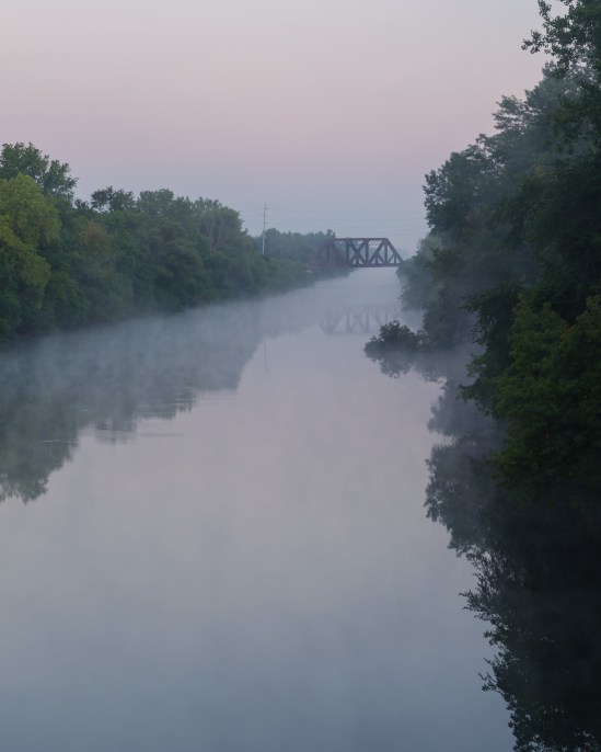 The next two images are from the bridge over the barge canal looking west. I loved the fog rising from the water and the train trestle in the distance.