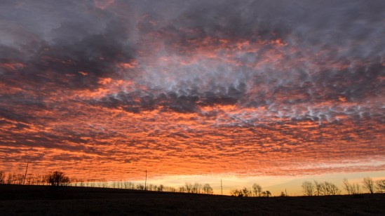 The day after Thanksgiving found me having to get out and moving early. Not to shop but to work off all the food I ate the day before. Luckily, it was a beautiful morning and unusually warm. We had traveled down to my mother-in-law’s house which is next to the heifer barn on the family farm. I went for a walk out into the fields and was greeted with an early color show prior to the official sunrise of the day.