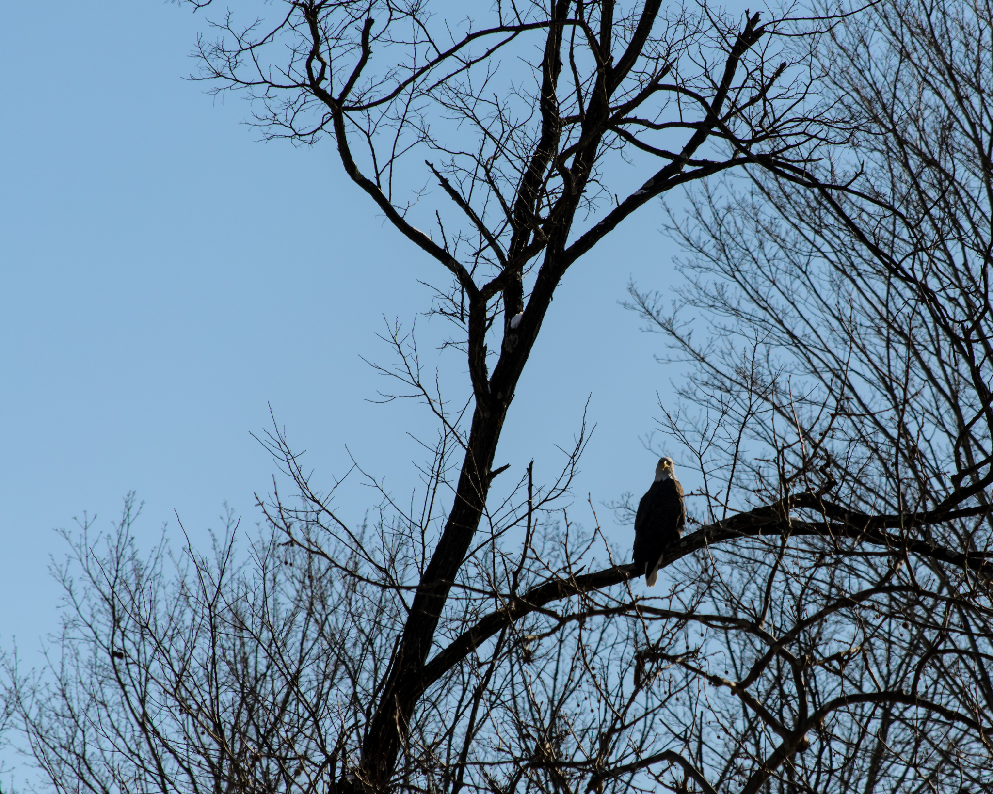 On the way back to the car I noticed the eagle was still sitting in the tree. I swapped lenses for my modest telephoto and headed down the trail along the opposite side of the river hoping to get close enough for a few captures. I now wish I had gotten the 70-300mm lens rather than my 55-200mm. I just didn’t have enough reach. Every time I would almost be close enough the eagle would fly further down stream. I pursued!