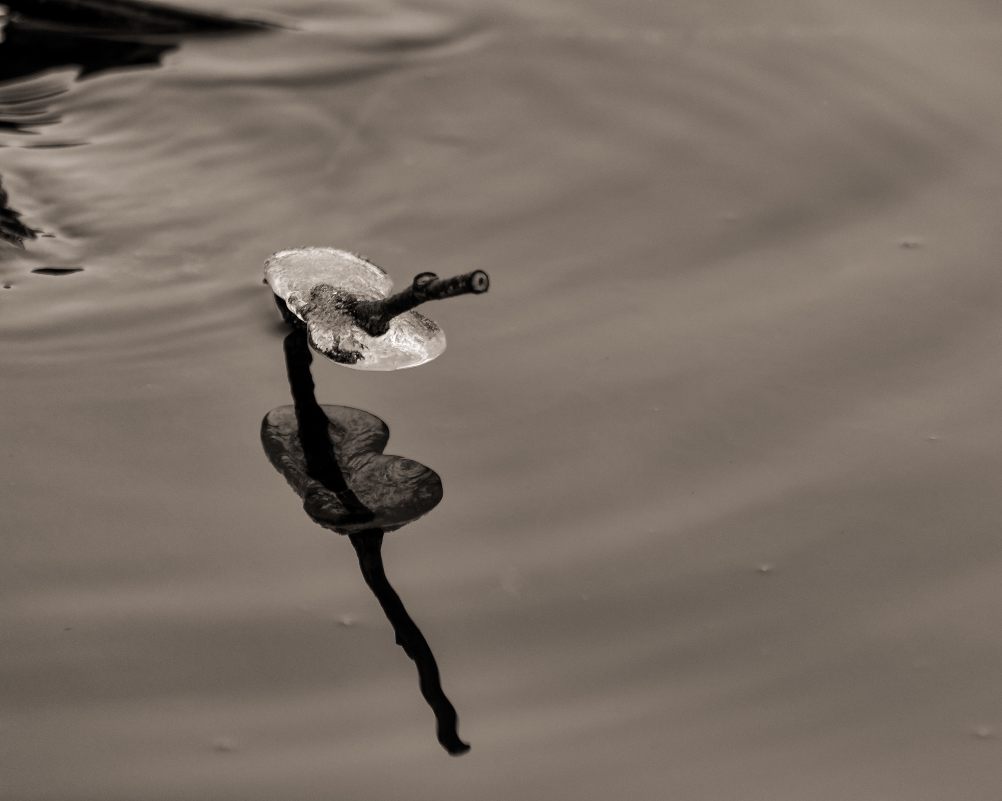 I was in between the old water bridge and the metal bridge looking for a different view of the spillway. I was trying to capture an image of the control house through the supports of the old water bridge but I’m not sure if I like any of the views I brought home. I did find this little chunk of ice clinging to a fallen branch. I was mesmerized as the water rose and sank with the current. I got pretty lucky as I managed to capture this image at the water’s low point to really highlight the detail of the ice in the reflection.