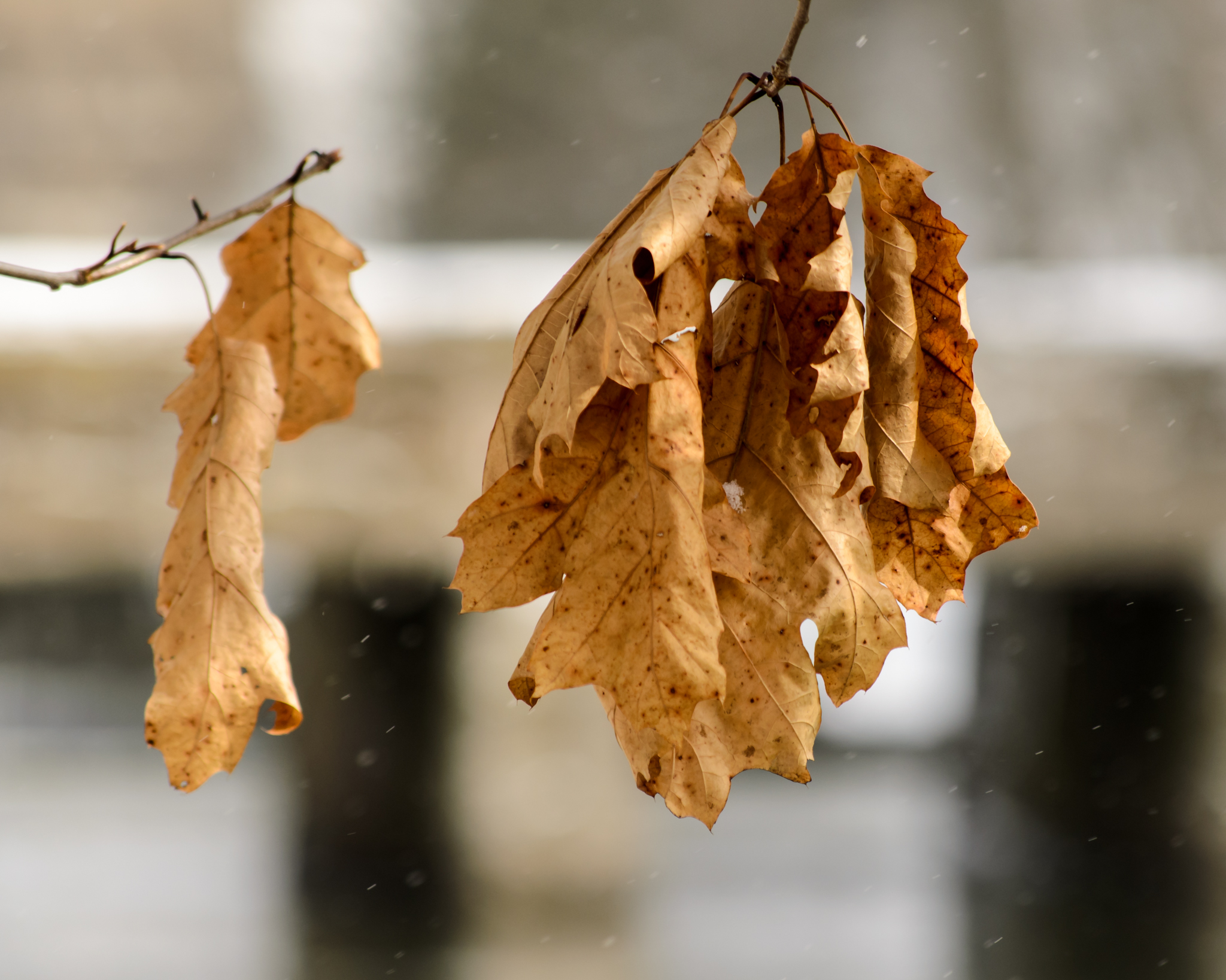 As I start walking down river I’m always on the lookout for leaves. If you haven’t guessed by now they are a favorite subject of quite a few of my images. I think it is due to the amount of detail you can find in a leaf as well as their color. In the fall it is the change from green that captivates me, looking for the red, orange, yellow standouts. But I think it is in the monochrome depths of winter with the leaves that refuse to fall I find myself always pointing the camera at them. In this image I used the old water bridge back upstream as a contrasting backdrop for my leaves.