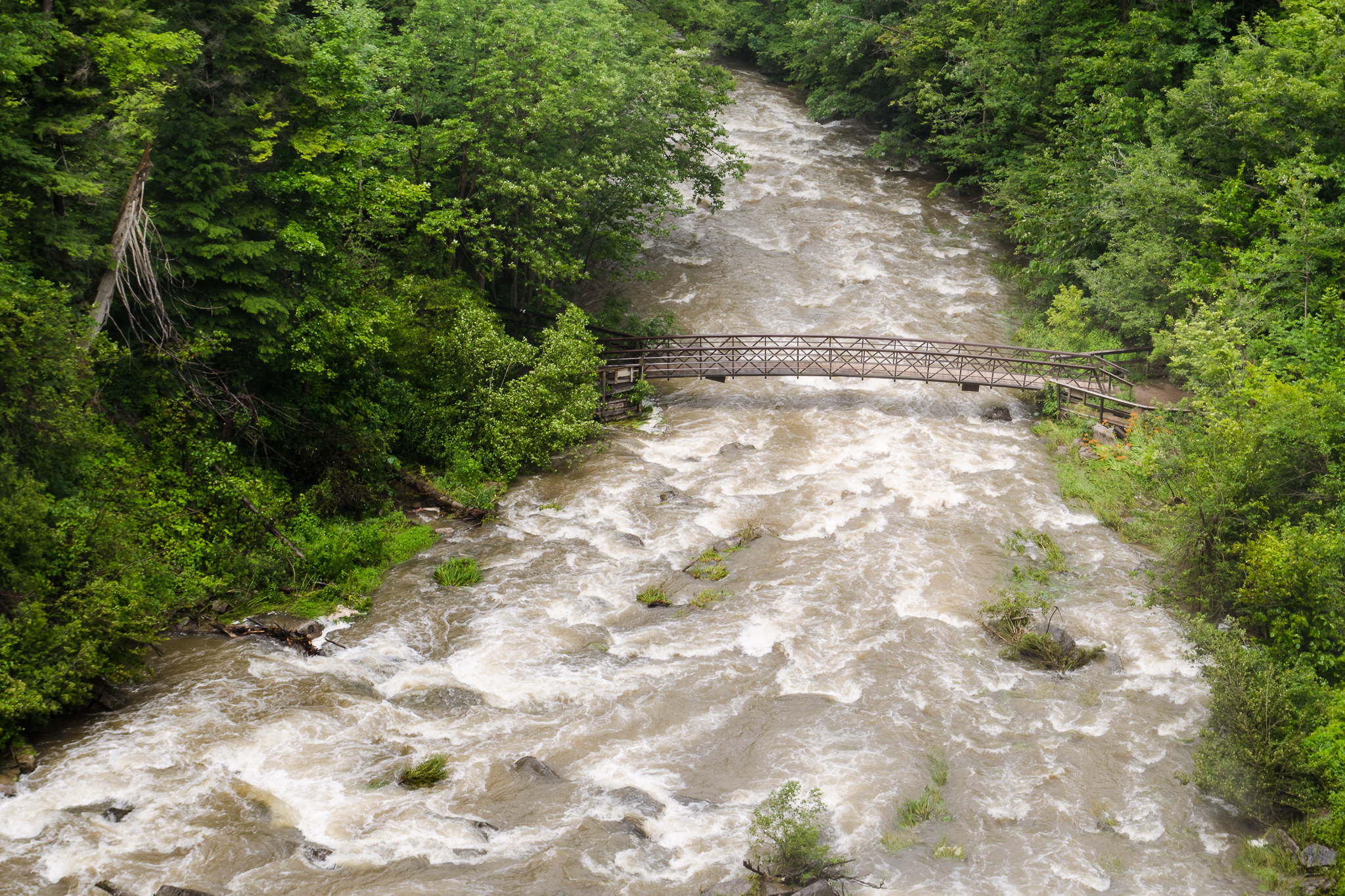 There are trails down to the base on both sides of the waterfall. I have never ventured on the side opposite the park and thought it would be nice to explore. On a day when there wasn’t as much water already on the ground my idea would have been OK, but the slippery path made for a very interesting climb down. This first image is from top of the falls looking downstream over the gorge.