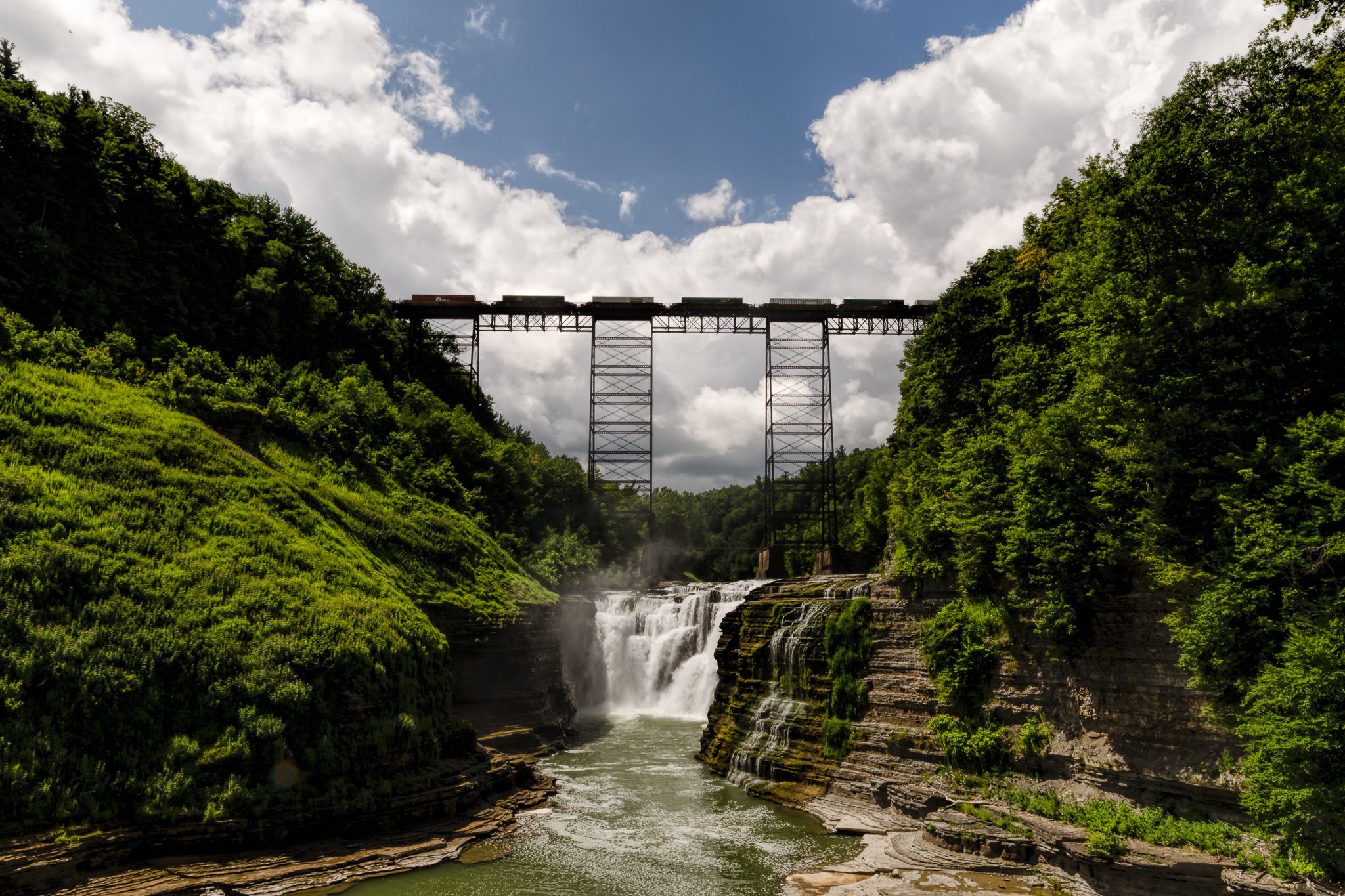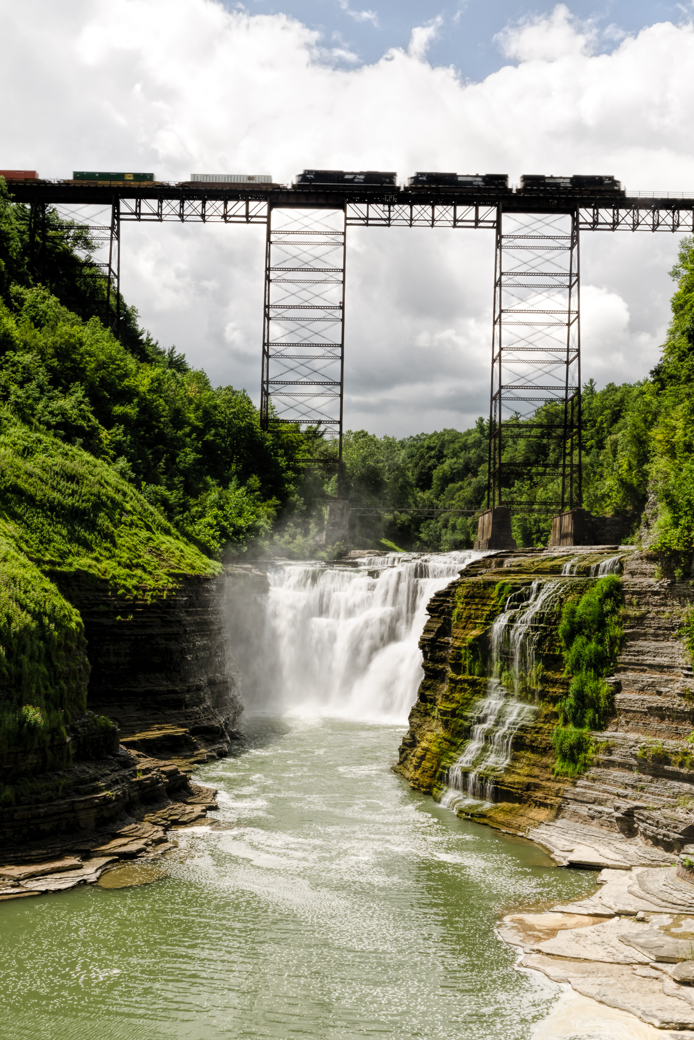 I finally have processed the last of the waterfall images from Letchworth State Park. The Upper Falls were a short walk from Middle Falls and although not as large in size they are visually impressive due to the sky high train bridge straddling the gorge right above them.