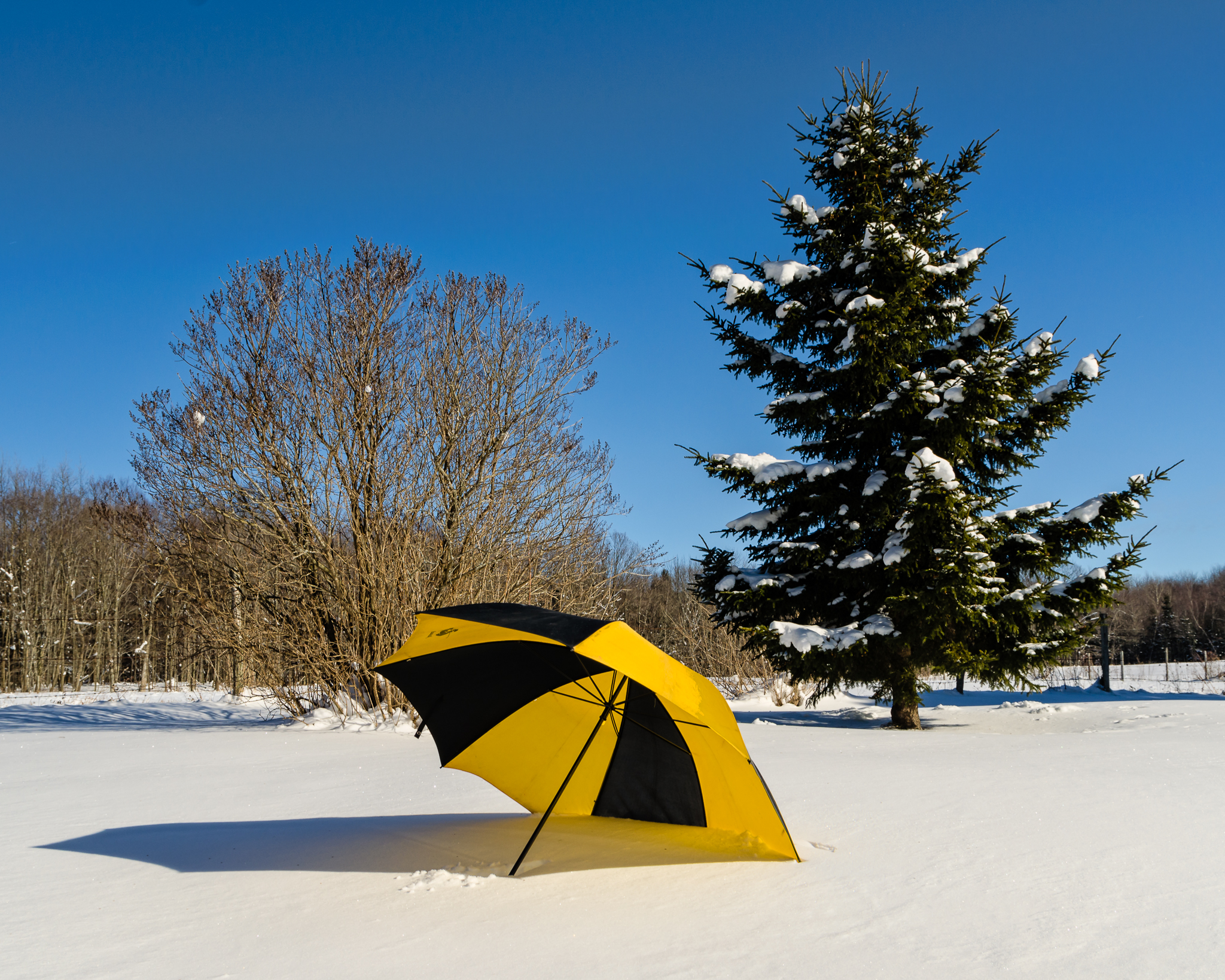 Saturday was a nice change of pace from the previous few days. The temperatures reached the lower 20’s and it felt absolutely wonderful outside comparatively speaking. I had an idea (I know, who would have thought) for a series of images I could use for the current week’s theme of square crop. I’m not quite done processing them yet so that post will be in a day or two, but when I was done I threw this golf umbrella in the yard. I really liked the bright yellow contrasting with the beautiful blue sky and I am always a sucker for a snow covered evergreen tree. 🙂