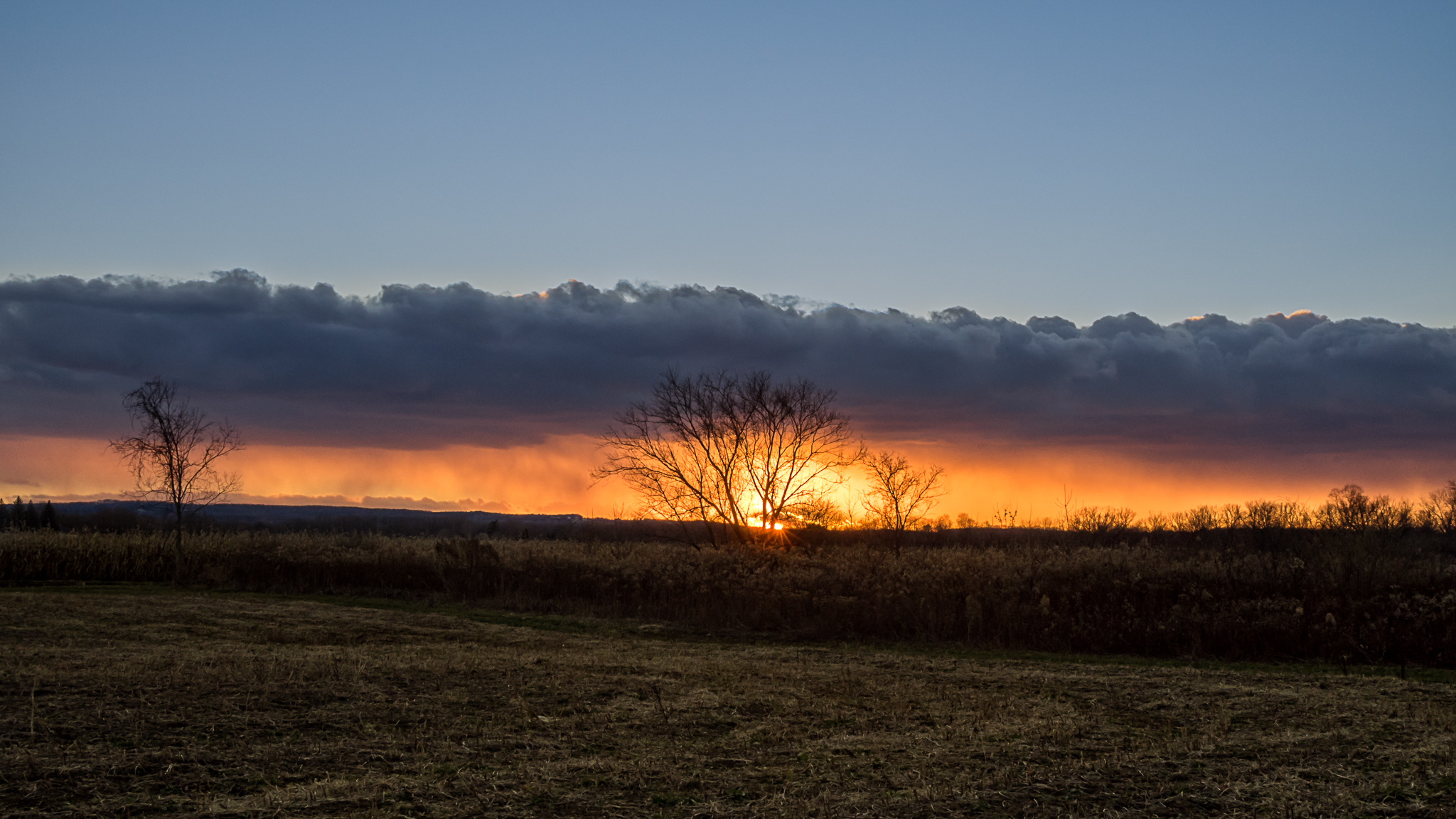 I got out of work a few minutes late last night and was greeted with a beautiful sunset as I walked out the door. My head was racing for a location I could capture this from before it was gone. I jumped in the car and started driving toward the sun. Nothing was coming to mind and the sun was disappearing fast. I found a back road with a field and some trees. A quick 3-point turn and I pulled off into the field. I wish I had something better in the foreground but those colors were not to be missed.