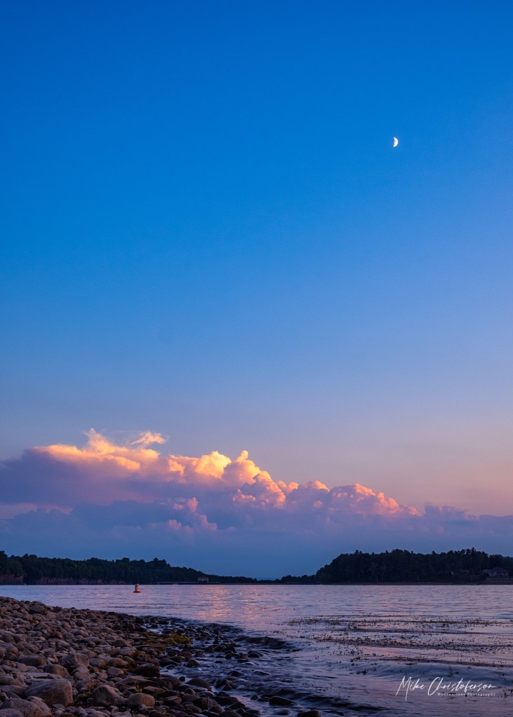 I was at Delta Lake to capture the sunset. It was the moment the sun slipped below the horizon and typically signaled the end of the sunset experience. Most photographers know that the next thirty minutes can generally yield fantastic images as well as sky transitions into the blue hour. I was at the water’s edge waiting to see how the light from the disappearing sun would change the few clouds still scattered through the western sky when I turned to my left and saw the moon rising over the Delta Lake dam. The clouds in the East were still aglow for the sun with the moon sitting high and alone in the sky. Well, you don’t pass up a view like that…