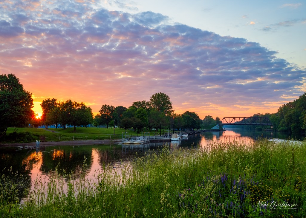 My go to spot for a sunrise image at Bellamy Harbor is gone! It is next to the flow control gate on the Barge Canal. I could go right to the edge, place my tripod and have a clear view of the harbor, the canal, the Mill St. bridge and the sunrise. I’m thinking the city was having problems with unauthorized access to the gates. They put up an eight foot, chain link fence on both sides of the canal.