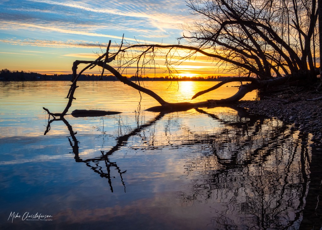 Another beautiful evening and another trip to Delta Lake State Park. Mother Nature must have heard my complaining about the boring sky on Monday because she definitely dialed the sky up a few notches. I knew exactly the view I wanted to capture. There is a fallen tree on the right side of the beach area that was going to provide a frame for the sunset as well as interesting reflections. I was not disappointed!