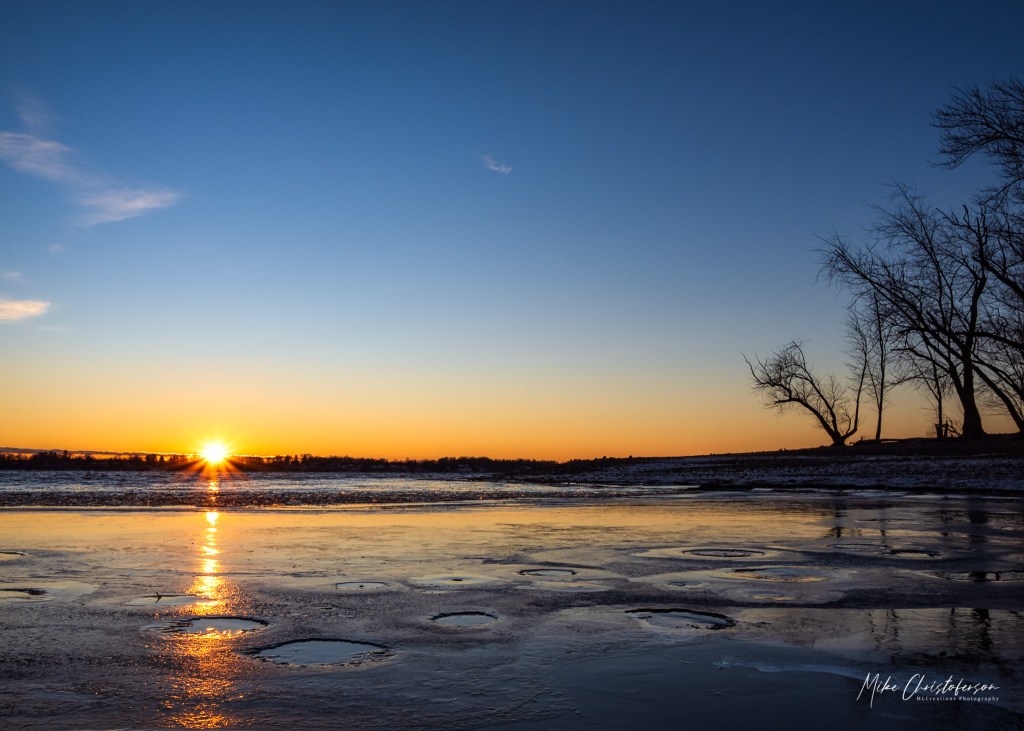 Dang! I thought I dressed appropriately but the wind cut through me with ease. I grabbed a few images then hid behind a group of trees while I waited for the sun to reach the horizon. I wanted to capture the colors reflected in the layer of ice which formed near the shore. Once I captured my view, I practically ran back to the car…