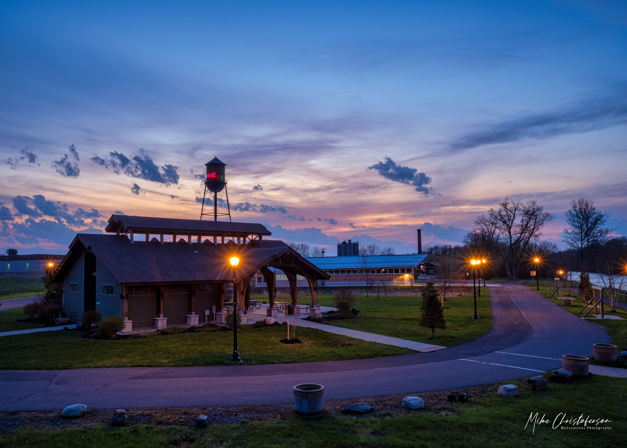 There was still Bellamy Harbor. The color in the sky was getting better so I hurried back to the car. I parked at the Mill Street end of the park and walked toward the canal. The elevation of the bridge allows for a great view of the East side of the park. I can include the pavilion, the Hamilton College boat house, and the water tower.