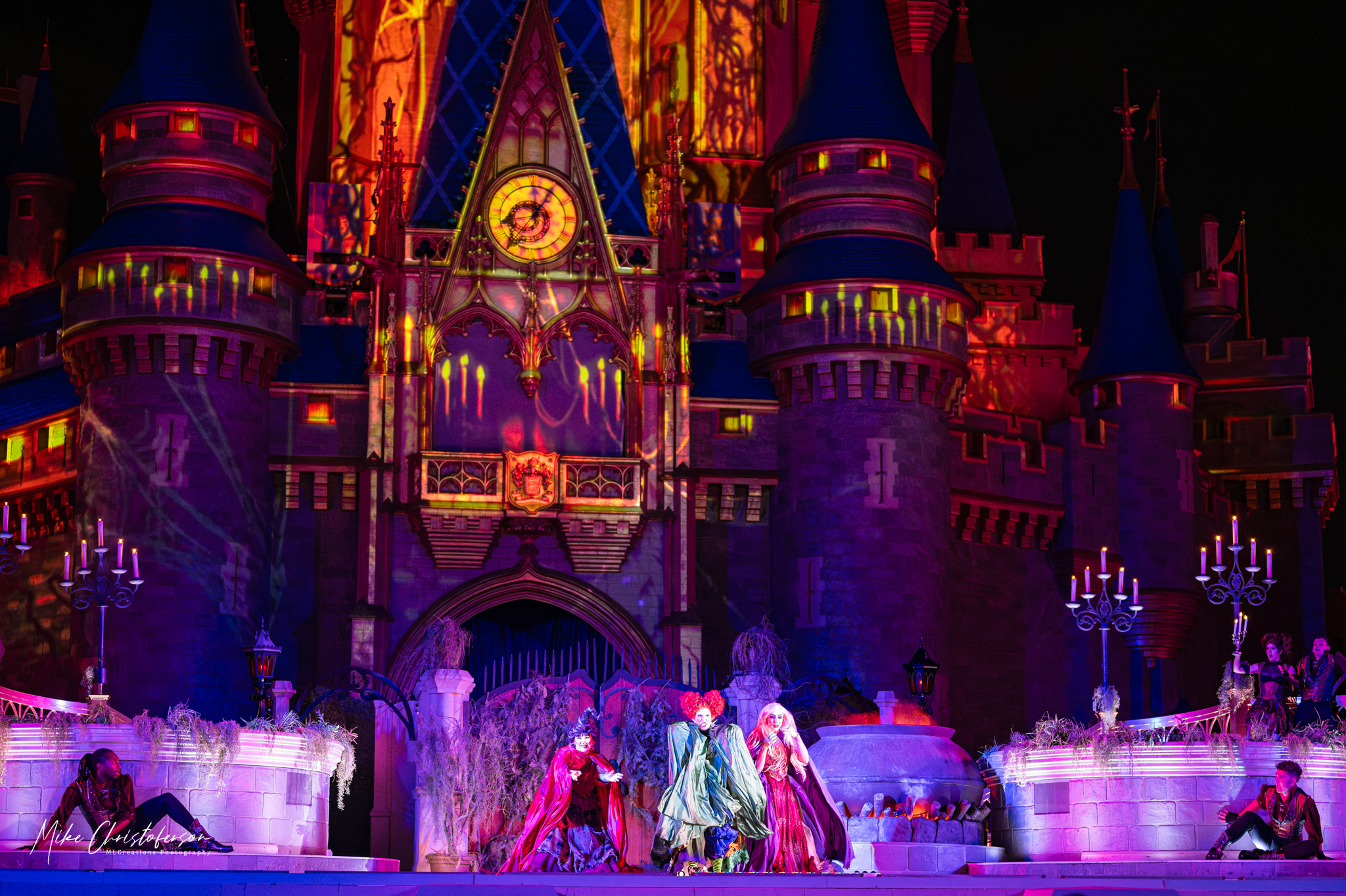 I wanted to photograph the Hocus Pocus Villian Spelltacular show on the center stage in front of the castle. I arrived 40 minutes before the start and the closest point for me was near the curb of the hub. It wasn’t a bad spot as it is a high point and I was able to easily shoot with my camera over every ones head. Of course, I only brought my 50mm lens (because it is a f/1.8 lens) so my images are not as close as I would have liked. The other shows throughout the night were just as bad (even the midnight show was packed!).