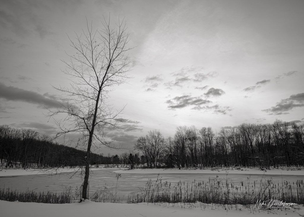 The lone tree has been a photographic pursuit of mine for quite some time. This image isn’t exactly the one I have in my head but I like it. Combine this solitary tree, separate and distant from the other trees, with a winter scene to evoke an emotional response. I was looking for loneliness and/or solitude. The two different processing styles, I believe, convey each separately.