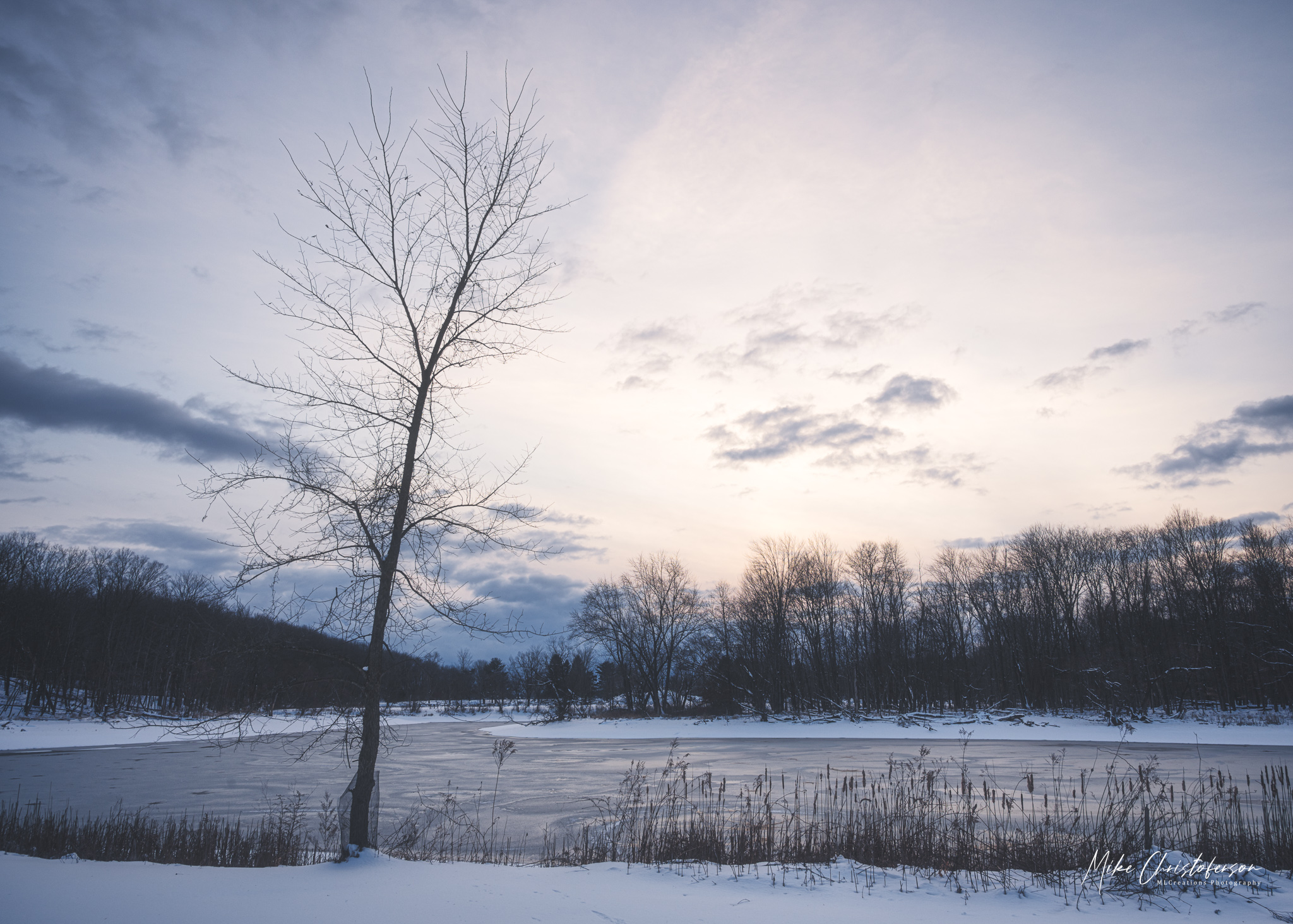 The second image I processed as monochrome. Removing the color takes away the impact it has on the image. The cold feeling is still there but only due to the visual clues in the image; i.e., the snow and ice. To me, this image has a stoic feel to it. The tree embraces its solitude.