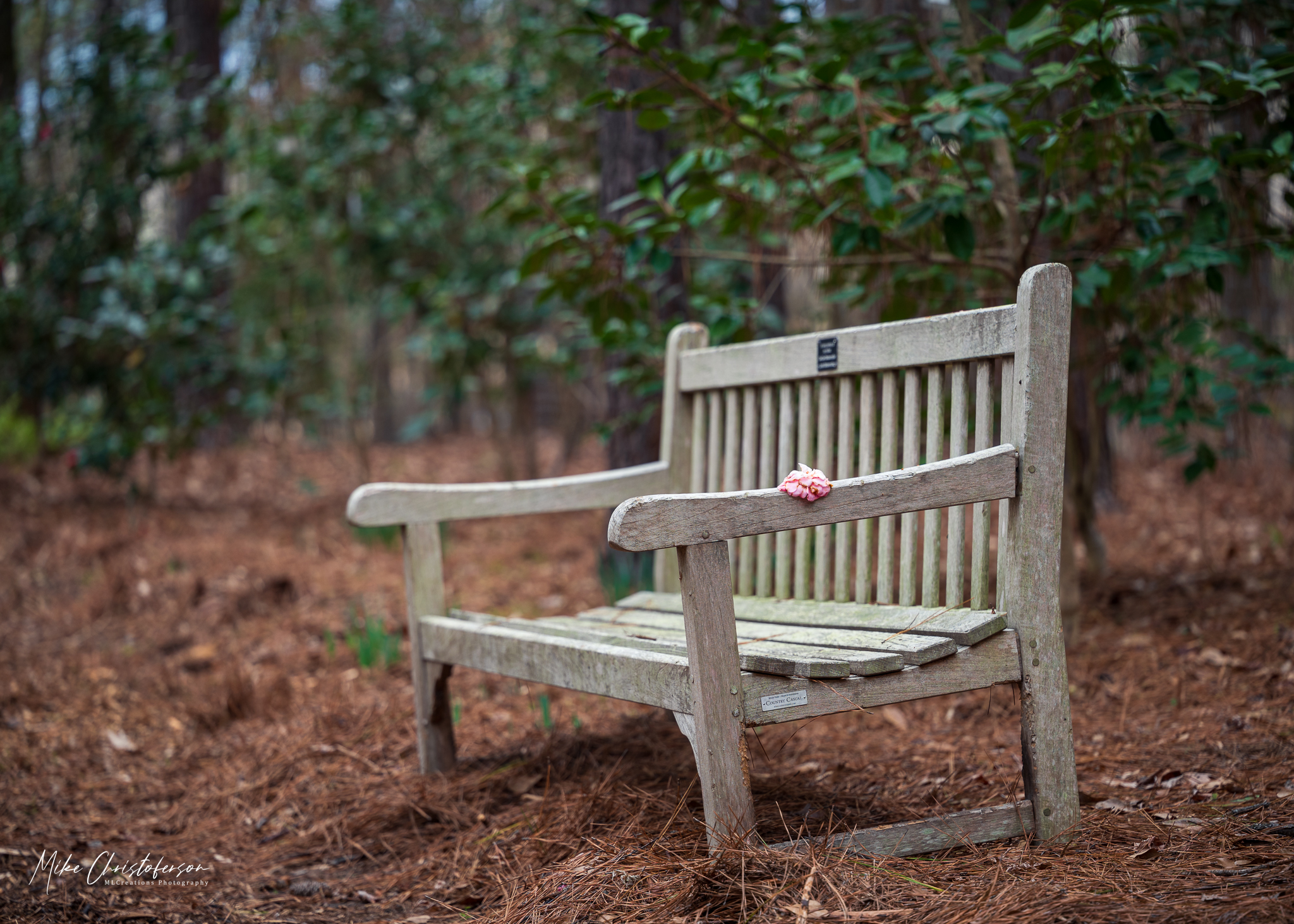 Not every attempt was successful. I don’t think I came home with a Camellia image I’m happy with but that gives me a reason to return (like I need one… LOL). The bench swing attempts (several different swings) didn’t do it for me, but I did find a bench where someone left a Camellia blossom on the arm. You already know I can’t pass up a bench.
