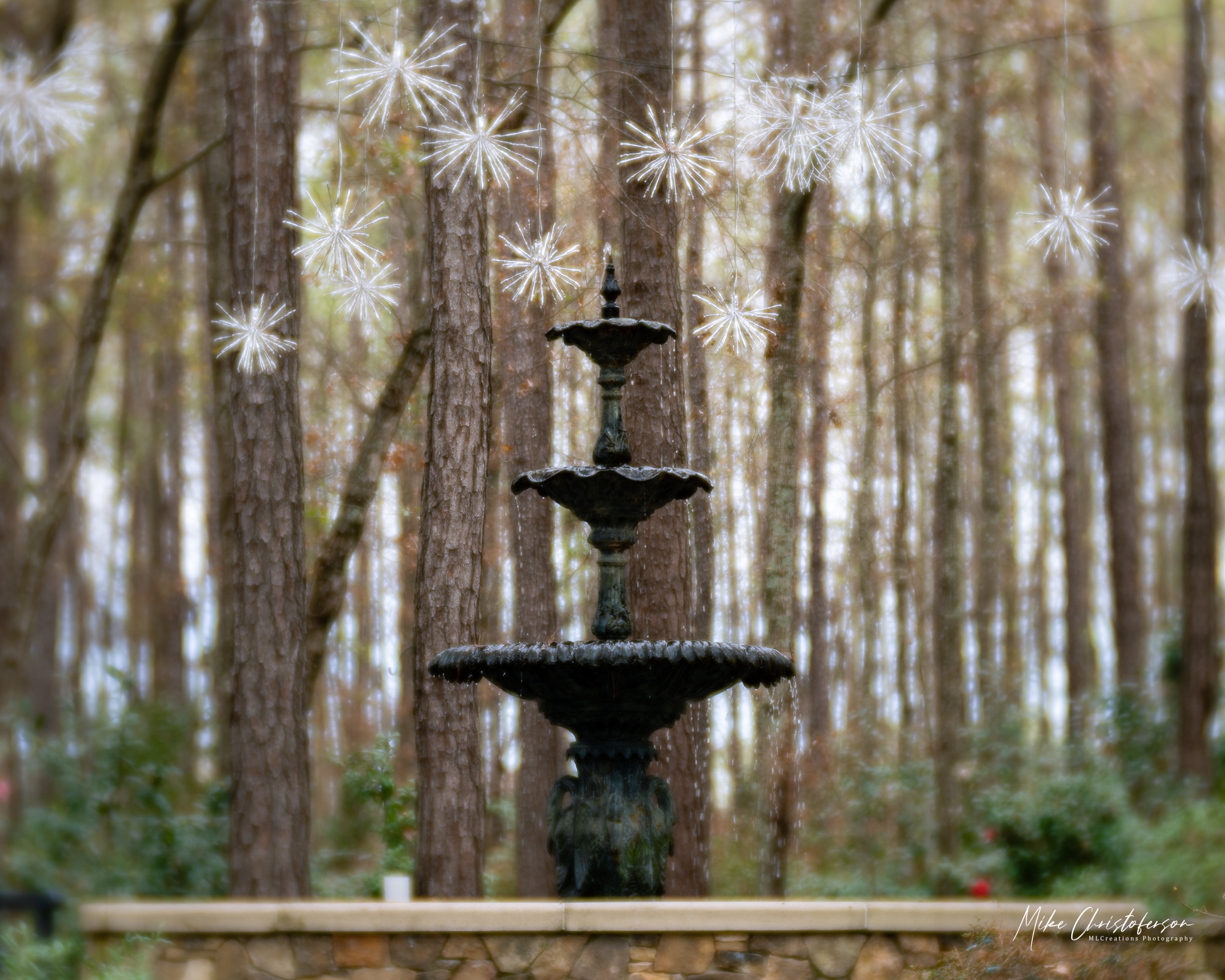 Eventually, I worked my way back to the fountain. It is a central feature of the Camellia Bowl garden. The snowflake lights from the Christmas event still hang throughout the garden giving the fountain an ethereal vibe. The properties of the lens also contribute to the effect. This is almost the same view as my Community image on the Shine post.
