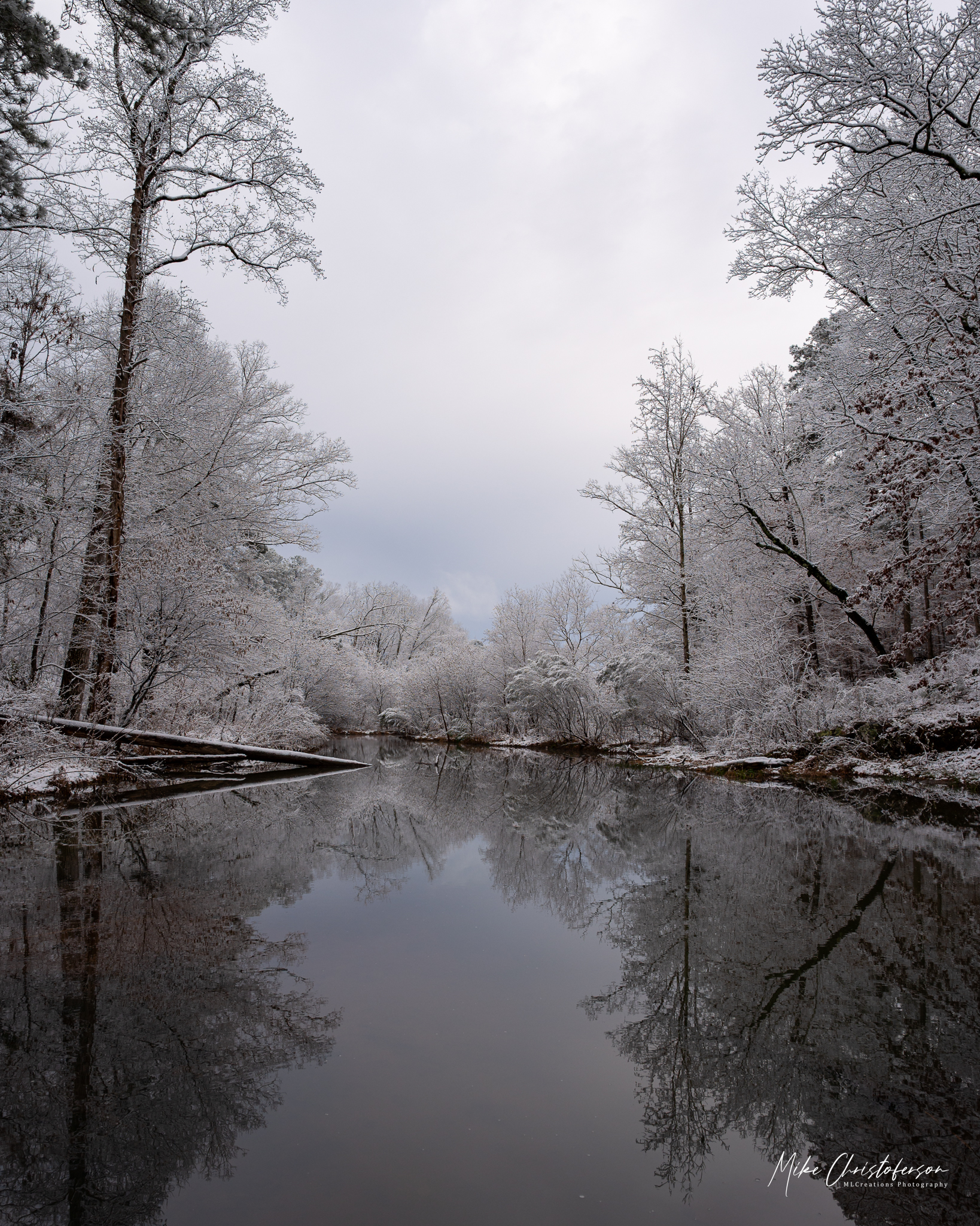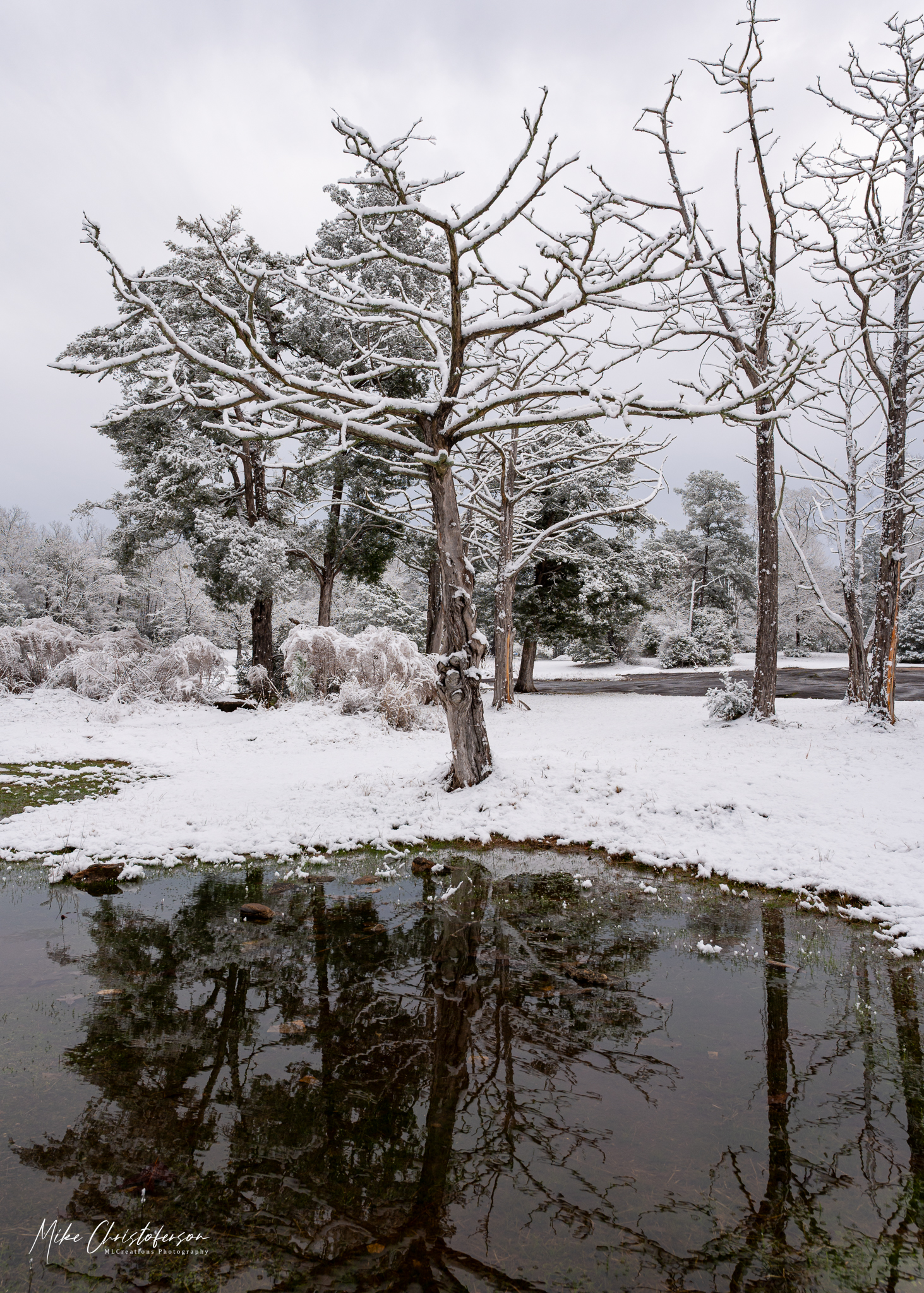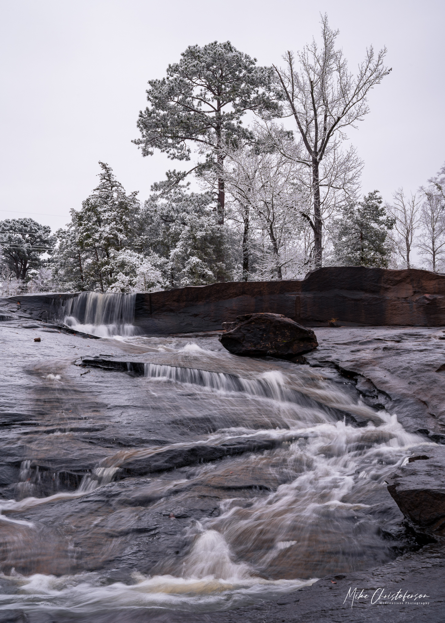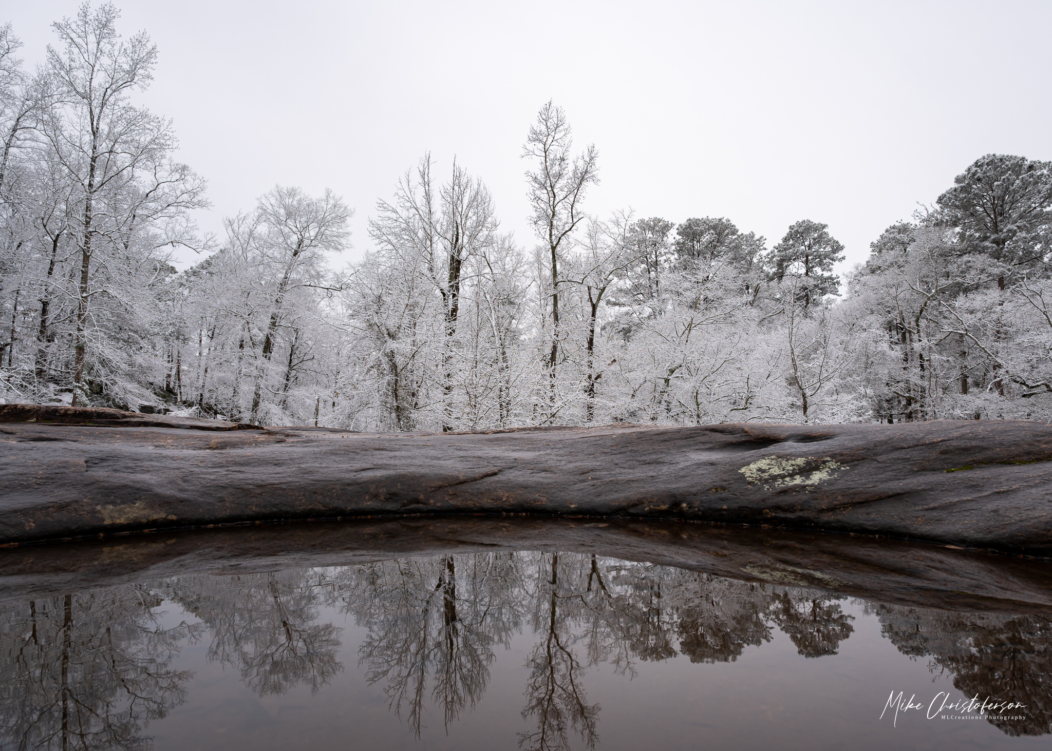 Standing atop the rock formation, surveying the snow covered trees, I bath in the serenity of the moment. A beautiful scene before me and sounds of the water cascading down the rocks. It can’t get much better until I spy an opportunity for a reflection. Yeah, no surprise there. I’m not exactly known for passing up a reflection image.