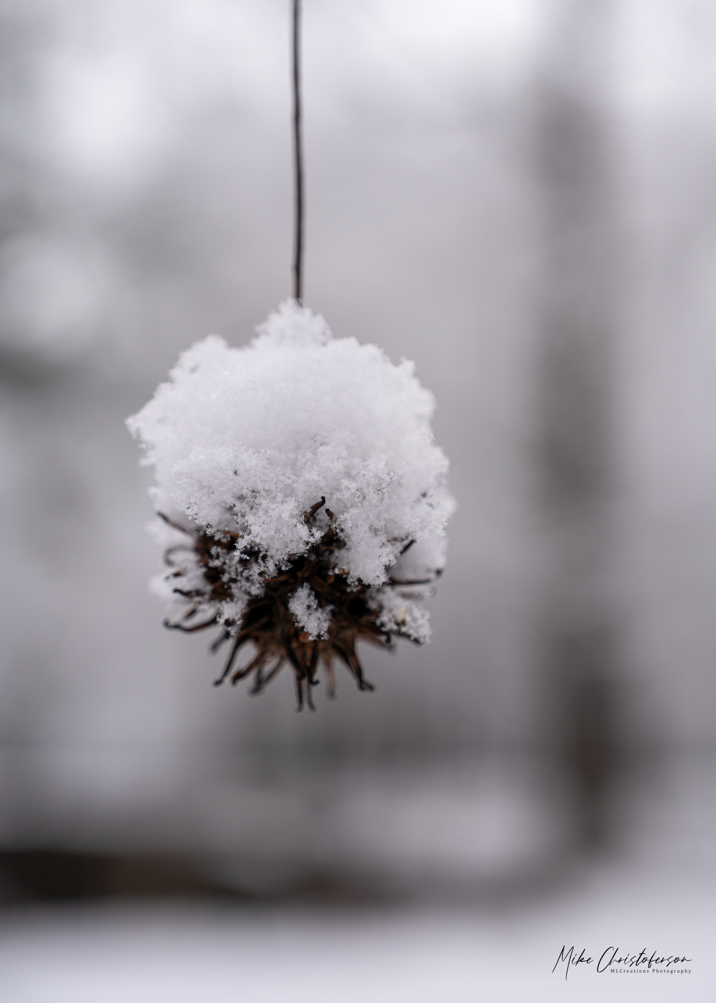 I pass under a sweet gum tree on my way to the trail I wanted to explore. I see that not all of the seed balls had fallen and they took it upon themselves to capture the snow. Looking at this image I wish I had captured a larger view with more of the hanging seed balls. Don’t get me wrong, I’m not disappointed in this macro view showing the snowflakes…