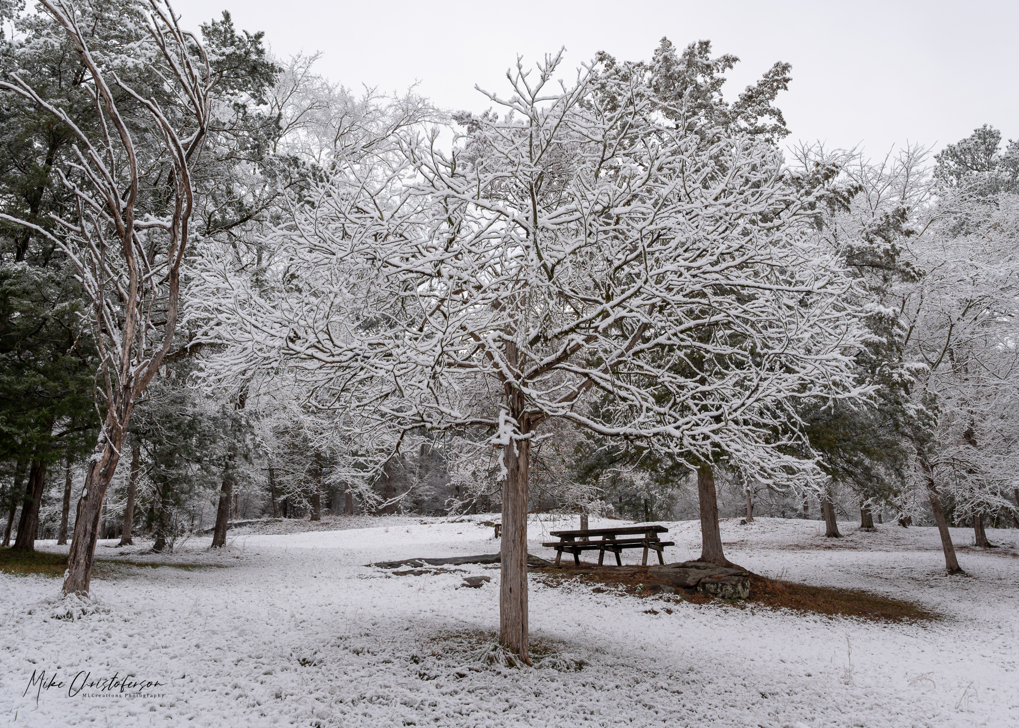 I should be honest with you, the trail I wanted to follow/explore leads to the tree and picnic table I have posted twice now. I was curious what the snow would bring to the scene. At least I changed it up a little because the next door neighbor tree was more interesting with the snow covered branches.