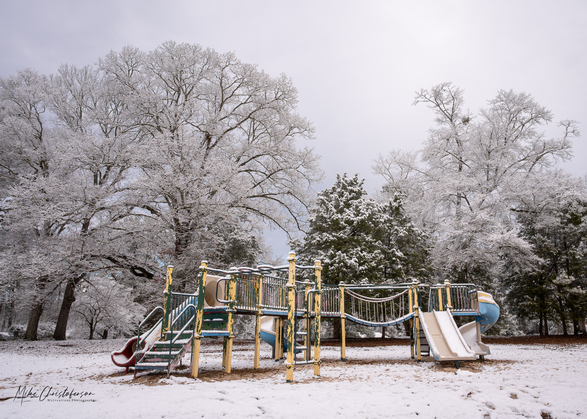 Although it was a nice morning, my hands were starting to get cold. Yeah, I know, I should have brought gloves but I didn’t. Time to work my way back to the car. I’m almost there when I see the playground off in the distance. Yep, I can’t pass on that view. It was too much to hope for that the snow was still undisturbed, but a great image none the less.
