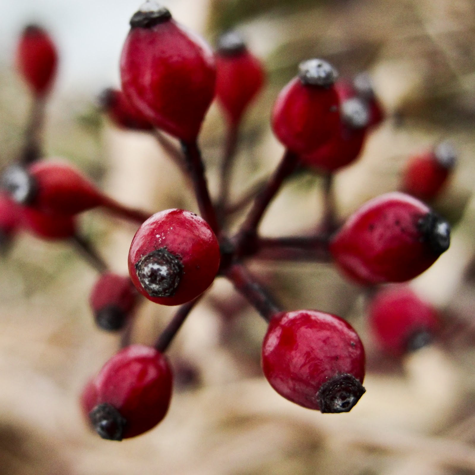 The wind was blowing just a little more than I would have liked but I managed to get the top down view of the berries that I wanted. The background winter grass was a better color than the white snow, trees and grey sky I used yesterday. I was able to play more with the depth of field on the top down view which suited what I envisioned.