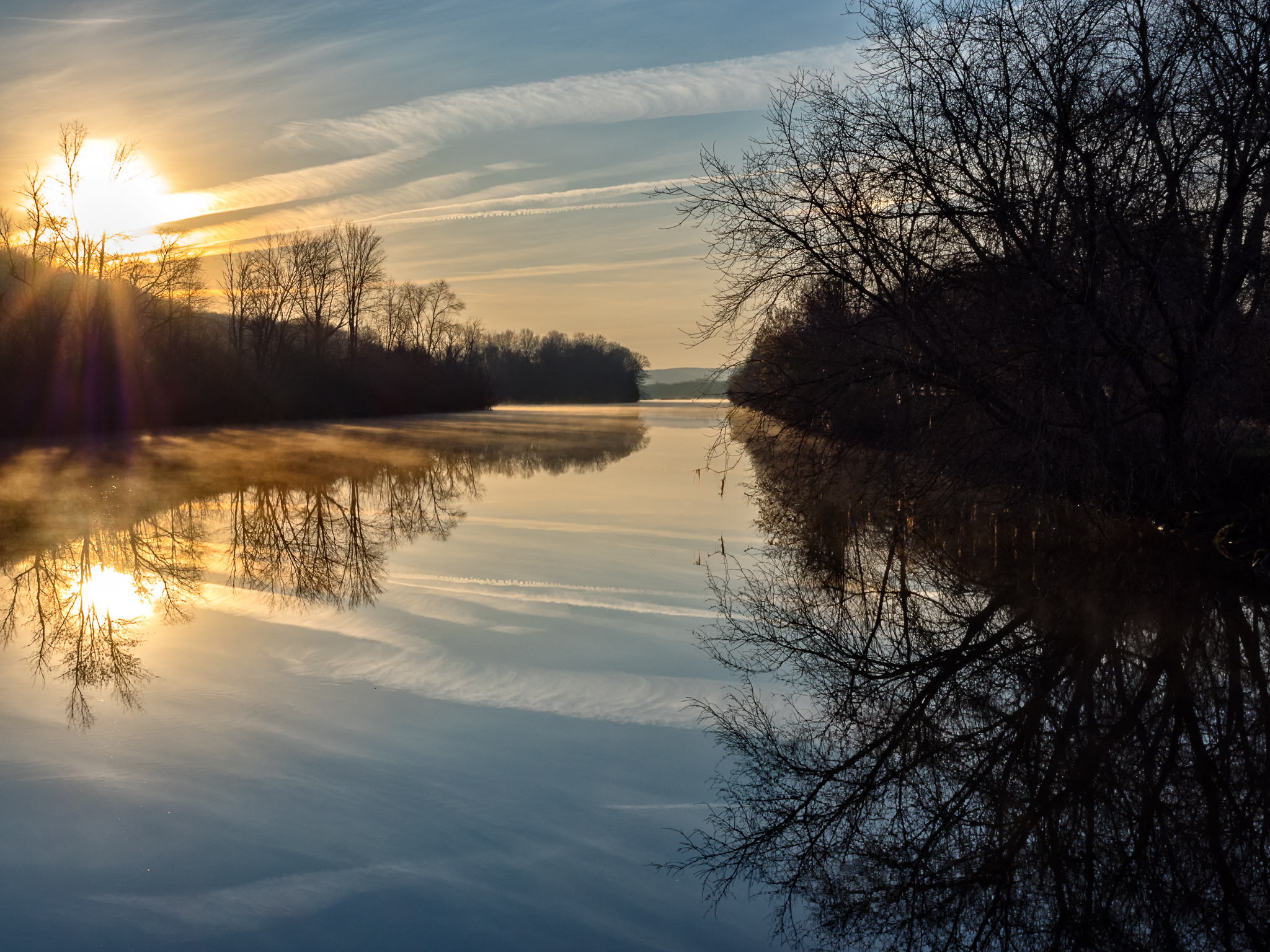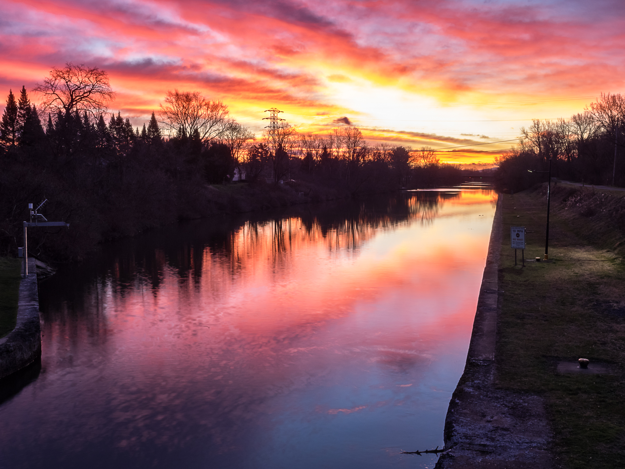 I wanted to catch the sunrise from the Barge Canal. The past few mornings have been wonderful for sunrises (at least as I looked through the shop windows at work). I noticed there was still a thin layer of ice on the barge canal and thought it would add some nice broken reflections for the sunrise.