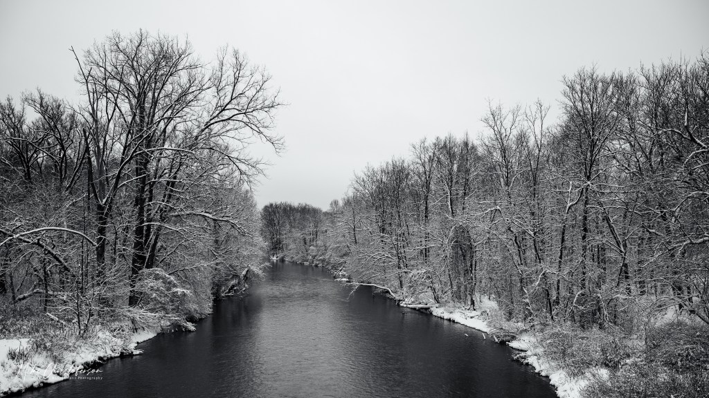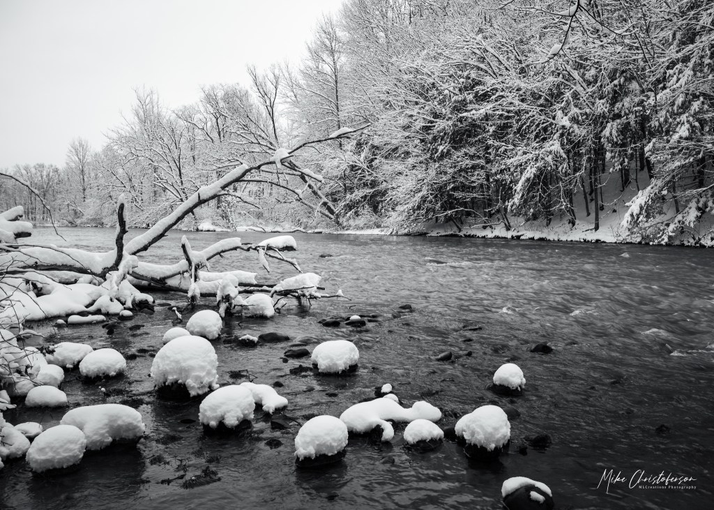 The bridge over the river provides one of the best views looking downstream. I have captured this view on almost every walk. The wet snow sticking to the trees definitely creates a classic winter scene…