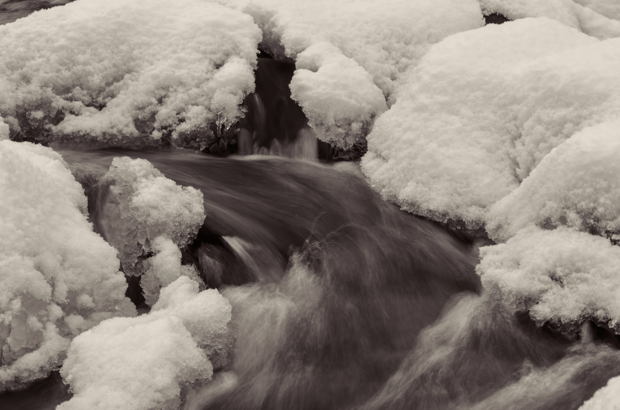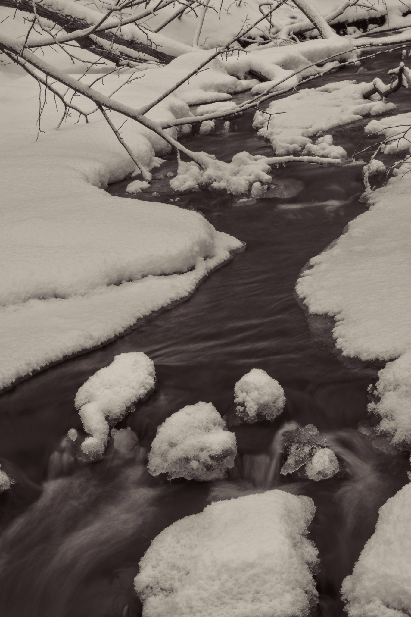 These three images in particular where about capturing the flow of the dark water and the texture of the new, puffy snow. You might also notice that these are not exactly B&W images. I prefer either a platinum tone or a silver tone to a lot of the images I convert. The silver tone especially handles the slight tonal differences better in the mid tones. I like the way a platinum tone brings out the subtle differences in the highlights of the snow.