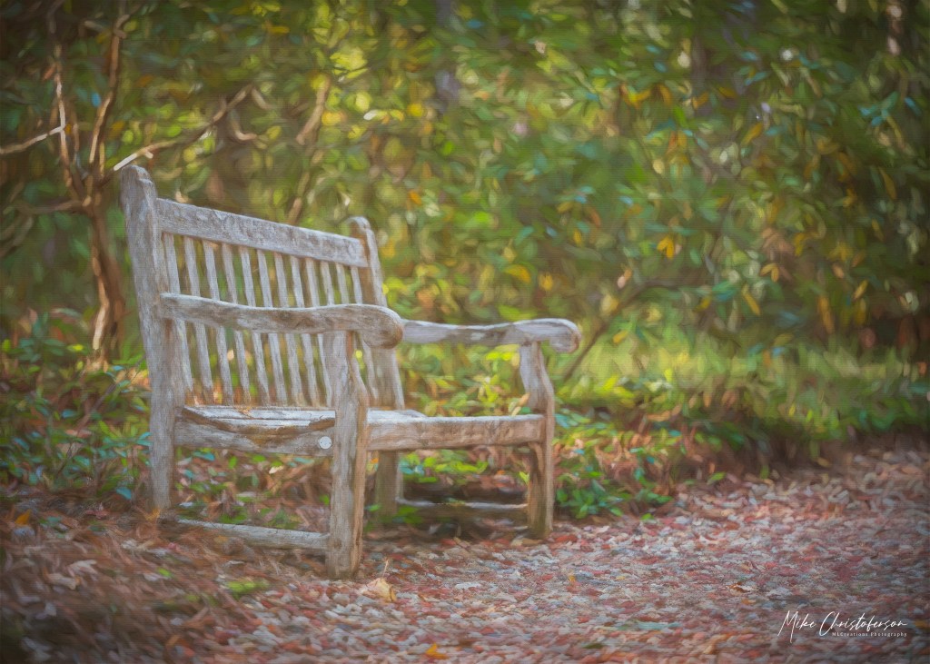 Walking the trail near the Butterfly Center I came upon this bench. I had the macro lens still on the camera but I was able to get enough distance to make this image. I loved the weathered look, the light in the trees behind the bench and the leaf covered path. My first thought was to convert this image to look like a painting, or at least my version of a painting… 🙂