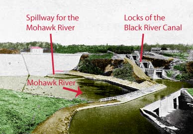 The image a couple of days ago was down at the water’s edge in front of the canal aqueduct. This is the big view of the damn as scene from the bridge over the river. As much as I like the dam, I’m more fascinated by the aqueduct. When building the dam, there still needed to be a way for the Black River Canal to be accessible so a series of locks was built on the right side of the dam and the aqueduct was constructed over the Mohawk River. I found this image on the Low Bridge Production website.