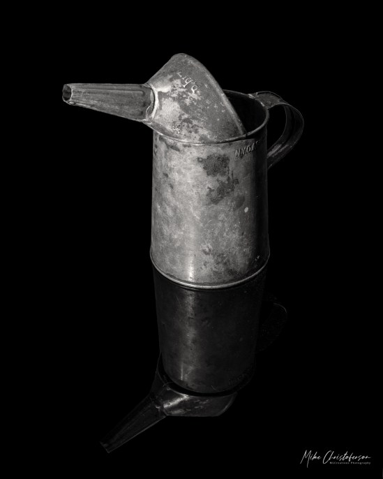 The second image in my next wave of updates to the Oil Can Project. This oil can presented a few more challenges in the setup as well as the post processing. Most of the oil cans I have found are dark and well aged. This one is quite bright and shiny. The decal on the front is a very bright yellow which required some manipulation of the monochrome conversion in order for it to stand out against the oil can itself.