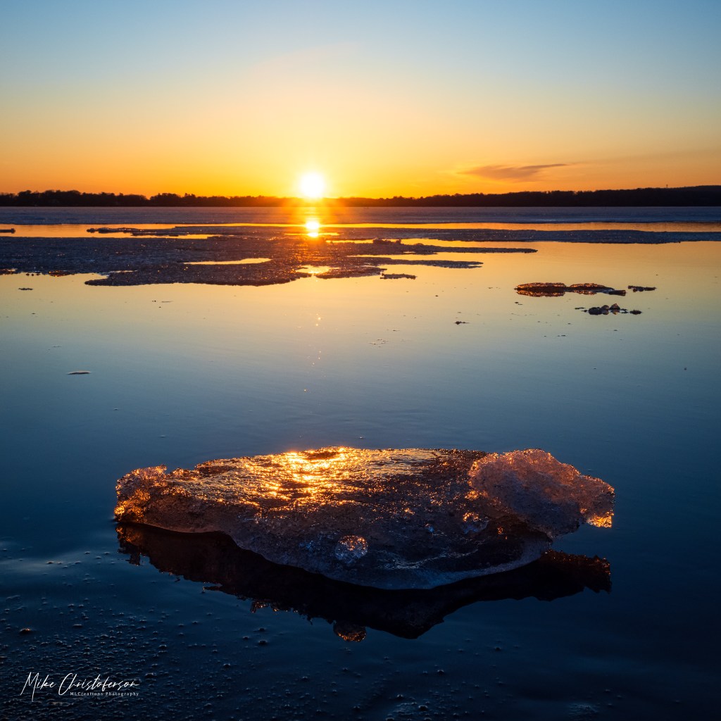 I found a small section of ice and water not affected by the wind. The sun was poised to slip beneath the trees on the opposite shore and the golden glow was illuminating a chunk of ice beautifully. Well, I couldn’t let this scene get away from me…
